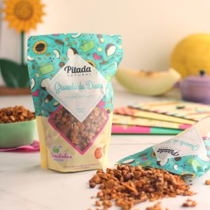 A granola é levemente adoçada com melado de cana, que é um ingrediente natural. É feita com aveia integral, linhaça integral e assada com óleo de coco extra virgem.
